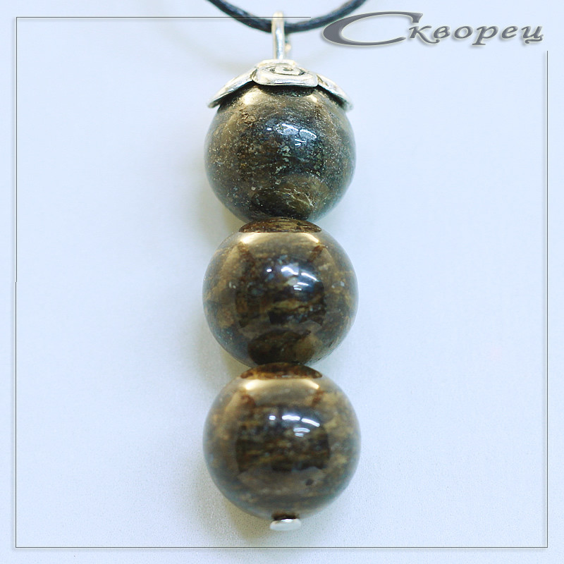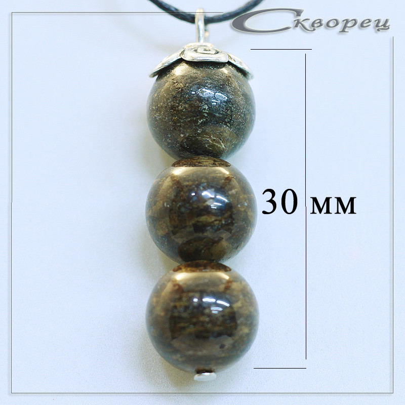 Элегантная подвеска из натурального бронzonита выполнена в виде трёх соединённых шариков диаметром 10 мм. Материал обладает характерной золотистой прожилкой, которая придаёт изделию индивидуальность и глубину.