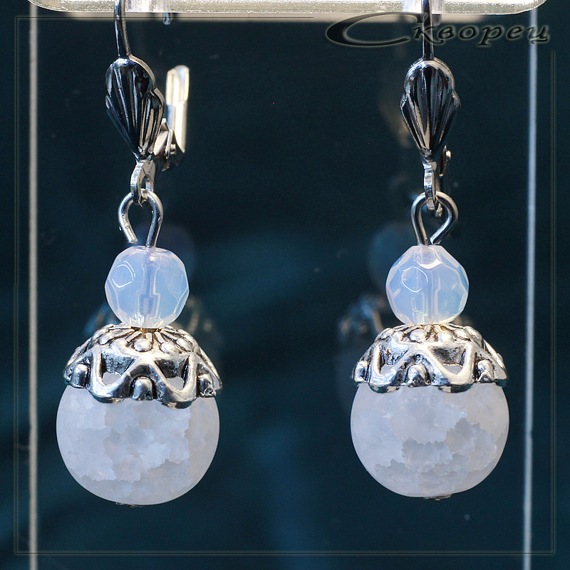 Серьги шарик из кварца сахарного, швенз из немагнитного металла под серебро, рекорирован литьевой накладкой в виде вензелей, акцэнт - ограненый шарик из лунного камня 6 мм, размер шарика 12 мм, вес - 9 гр.