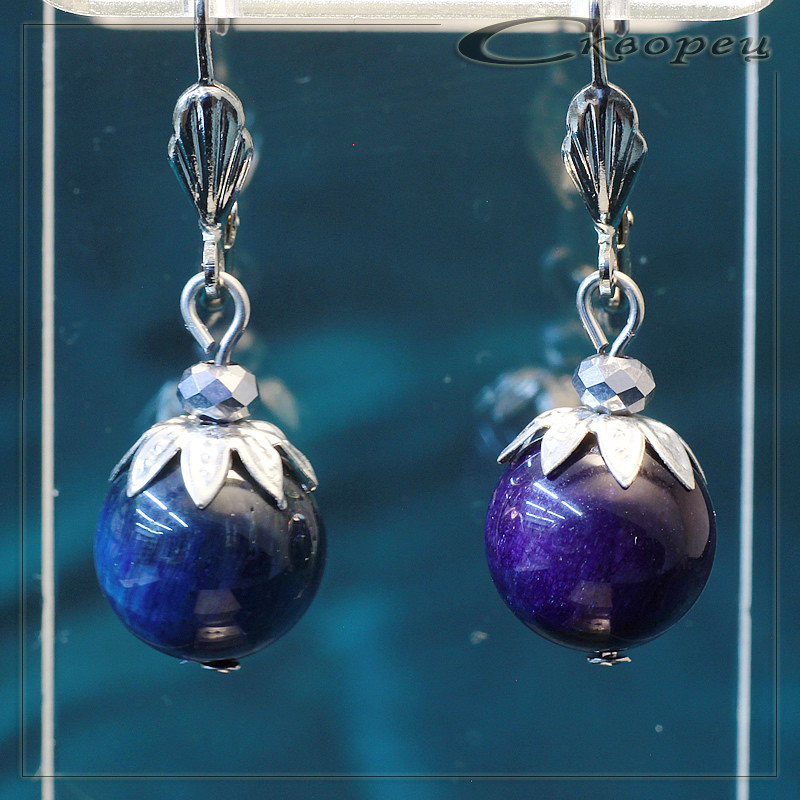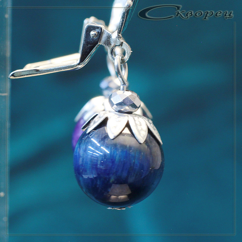 Серьги шарик Канзаши синий, швенз из немагнитного металла под серебро, рекорирован накладкой в виде листьев, акцинт - ограненый шарик из циркона 4 мм, размер шарика 12 мм, вес - 9 гр.