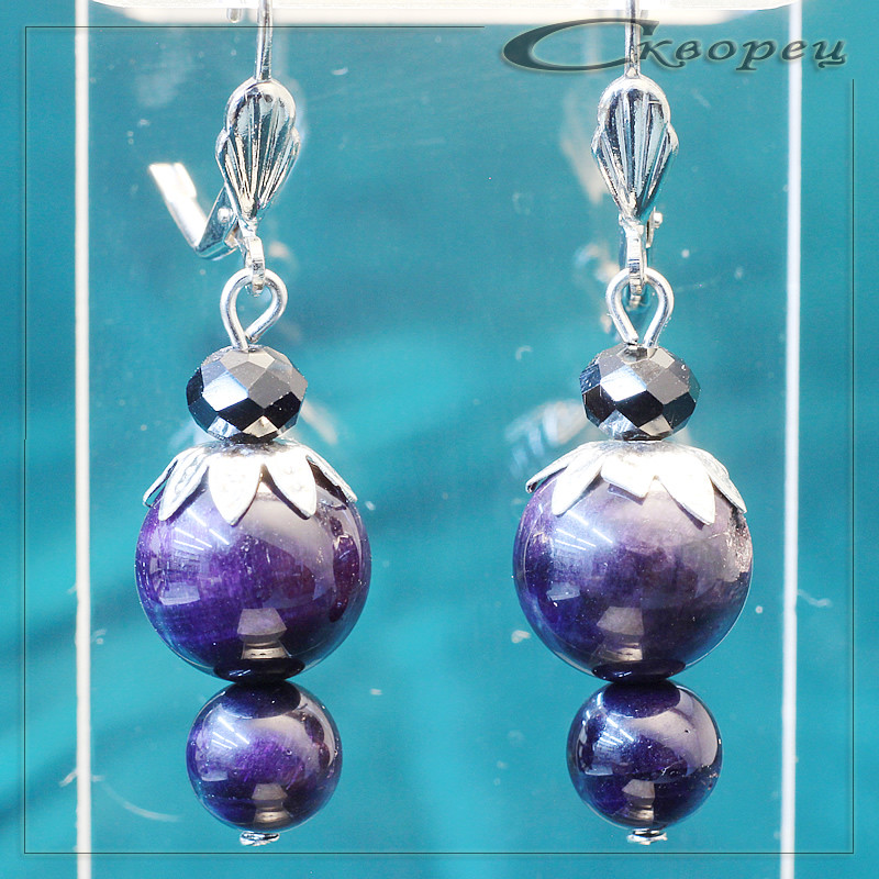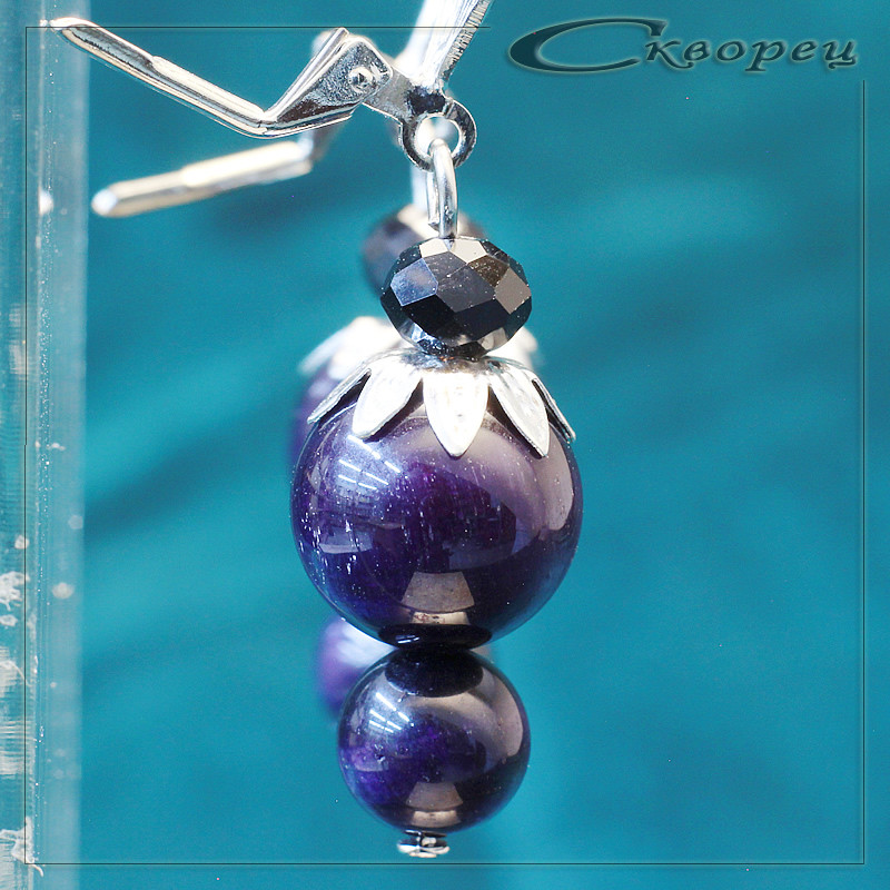 Серьги ягодка Канзаши синий, швенз из немагнитного металла под серебро, рекорирован накладкой в виде листьев, акцэнт - ограненый шарик из черного циркона 6 мм, размер шариков 12 мм и 8 мм, вес - 9 гр.