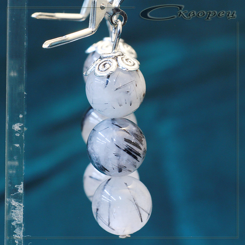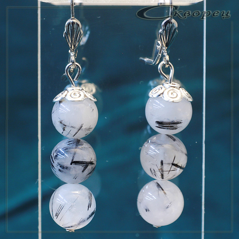 Серьги три шарика из агата волосатика, швенз из немагнитного металла под серебро, декорирован литьевой накладкой в виде вензелей, размер шариков 10 мм, вес - 12 гр.