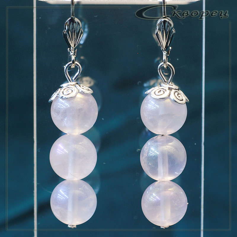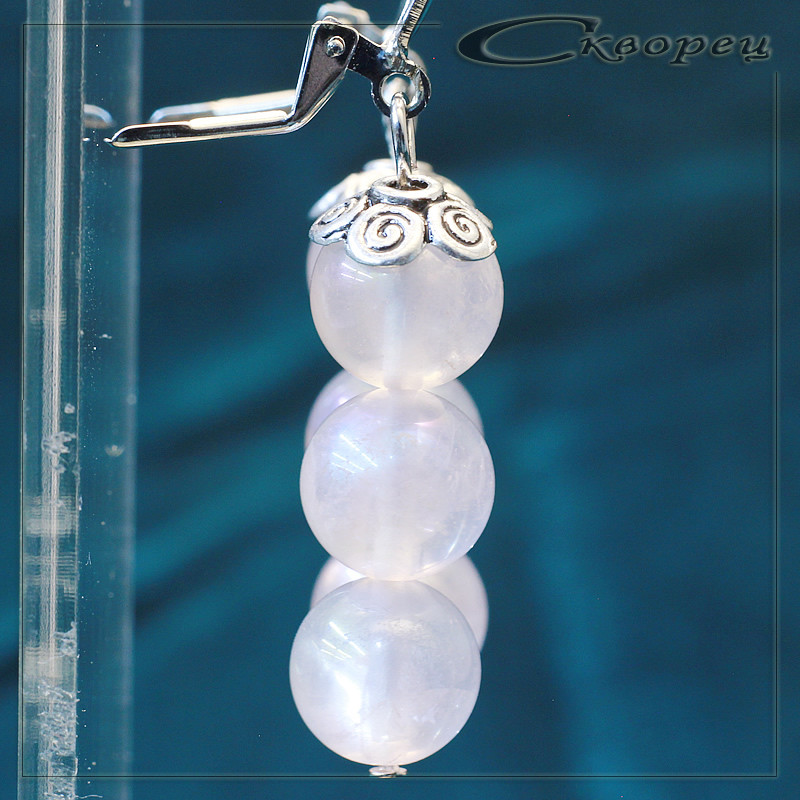 Серьги три шарика из розового кварца, швенз из немагнитного металла под серебро, декорирован литьевой накладкой в виде вензелей, размер шариков 10 мм, вес - 10 гр.