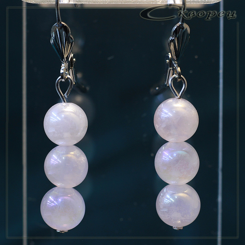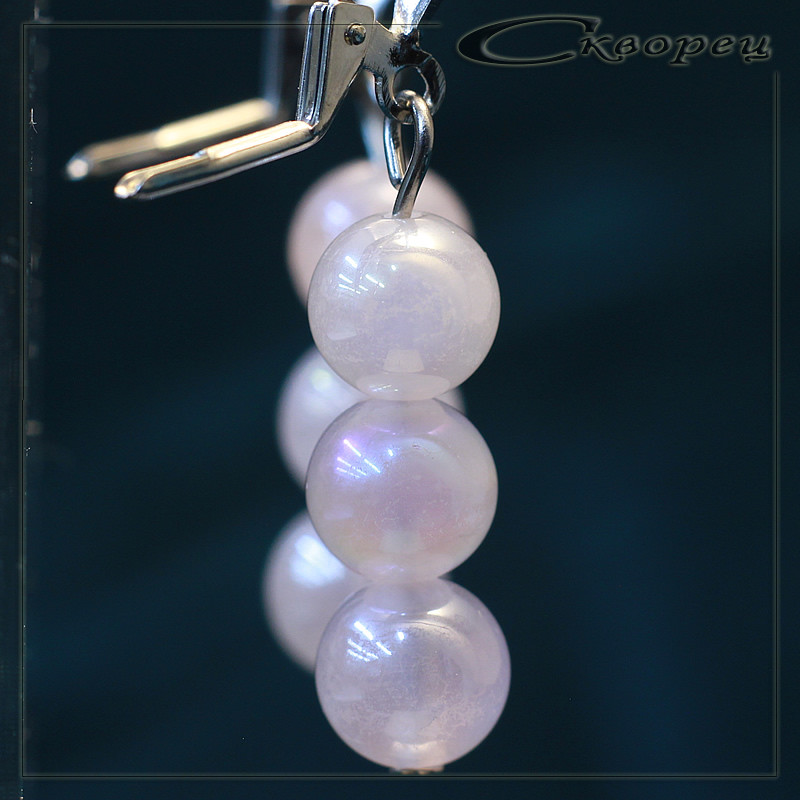 Серьги три шарика 8 мм из розового кварца, швенз из немагнитного металла под серебро, размер шариков 8 мм, вес - 6 гр.
